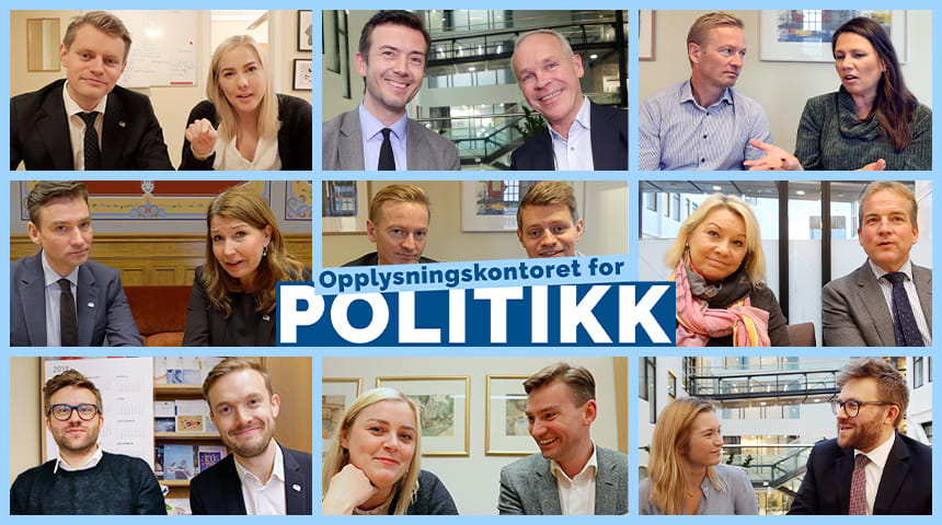 I YouTube-serien, Opplysningskontoret for politikk (laget av Høyre), møtes to av våre politikere til en uformell prat om aktuelle temaer. Det er laget 17 episoder, som handler om alt fra hvordan regjeringens nye jernbanepolitikk påvirker deg, og om ny politikk for å gjøre norsk skole enda bedre.