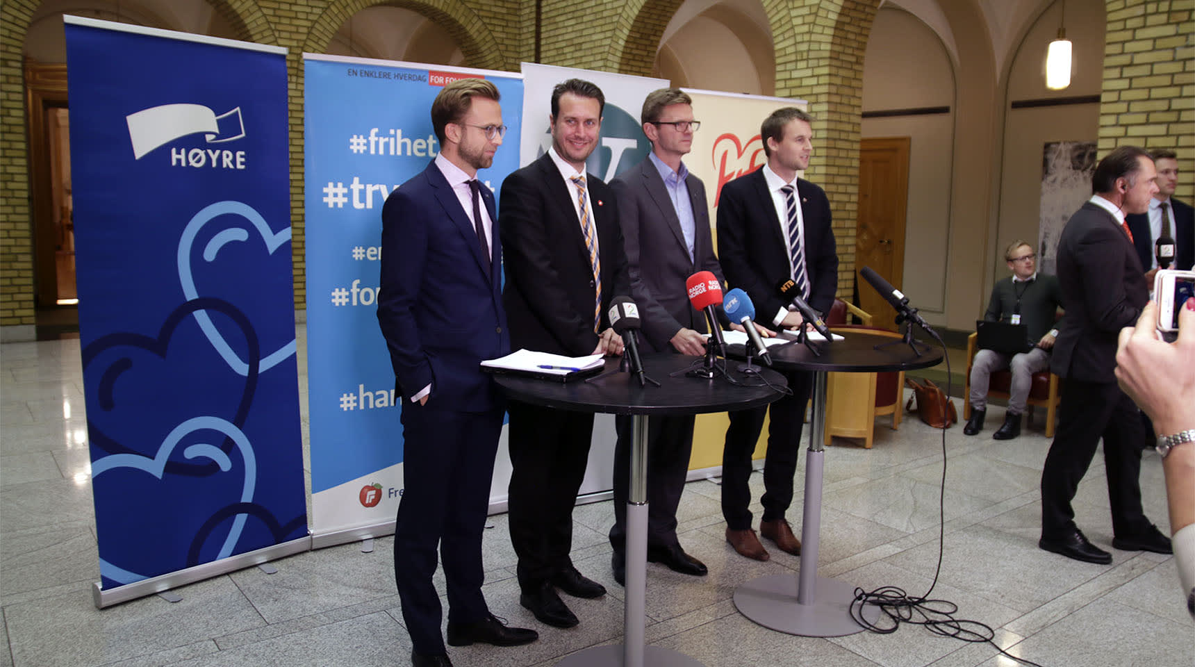 – Det føles veldig godt å kunne presentere en enighet mellom de fire partiene. Partiene har vist stor vilje til å bli enige, og gi landet et godt budsjett for flere jobber og et bærekraftig velferdssamfunn, sier Høyres forhandler, Nikolai Astrup.