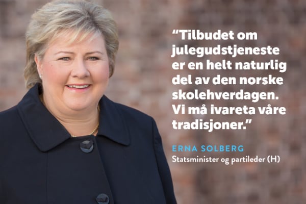 – Det skal være valgfritt, og lærere og foreldre bør diskutere hva som er naturlig for sin skole. Men vi kan ikke bare fjerne skolegudstjenestene i den tro at andre barn ikke setter pris på det. Jeg tror faktisk de er mye mer åpne for de inntrykkene som det gir å se hvordan det norske samfunnet er, også til jul, sier Erna Solberg.