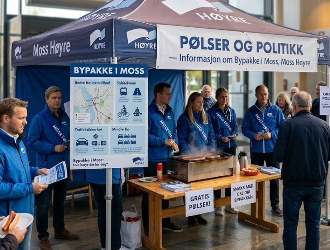 Vi inviterer deg til et hyggelig «Pølser og politikk»-møte hvor vi gir informasjon om Bypakken og mulighetene rundt bompengefinansiering i Moss.