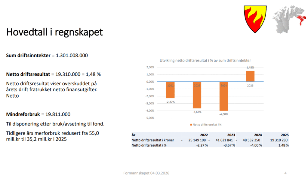 Fra underskudd til overskudd! I formannskapet 4.mars ble vi orientert om resultatet for 2025. Det viser 20 millioner i overskudd.