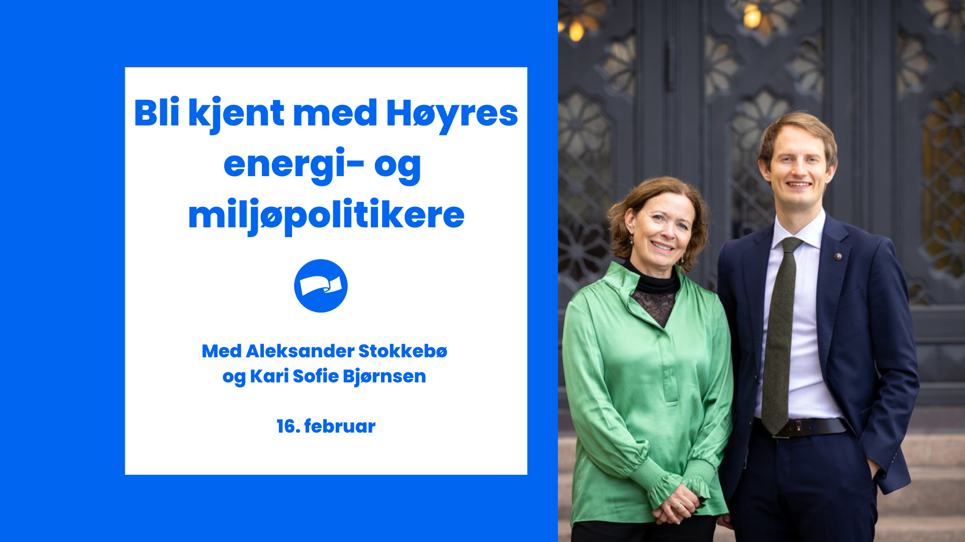 Rogaland Høyre inviterer til åpent medlemsmøte. Bli kjent med Høyres energi- og miljøpolitikere! Møtet blir med vår egen Aleksander Stokkebø, energi- og miljøpolitisk talsperson og fraksjonsleder for Høyre i komiteen. Med seg har han stortingsrepresentant Kari Sofie Bjørnsen fra samme komité, som blant annet jobber med å videreutvikle Høyres klima- og naturpolitikk.