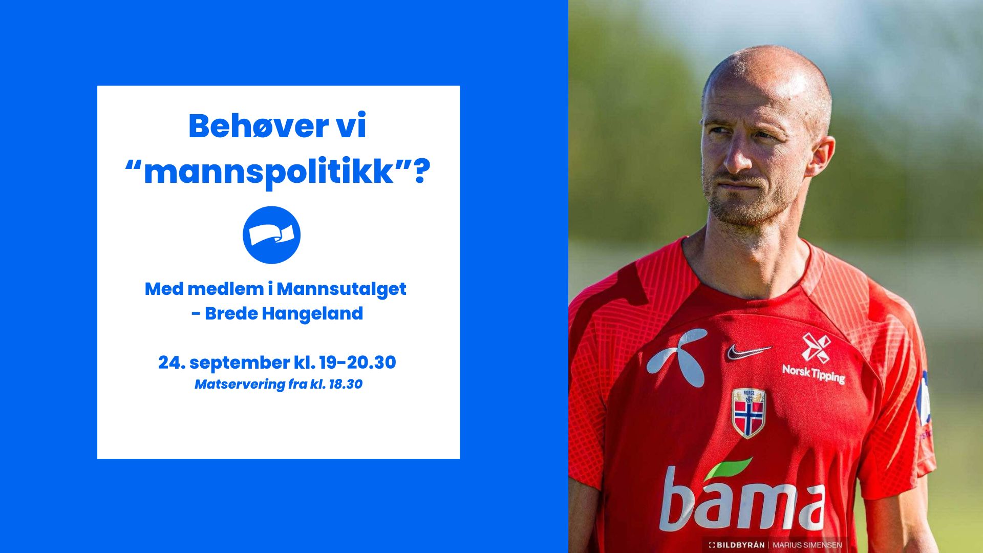 Det inviteres til åpent medlemsmøte💙Tidligere fotballspiller, Brede Hangeland, er i dag medlem av Mannsutvalget opprettet av regjeringen. Han vil snakke om temaet: Mannsutvalget og om vi behøver «mannspolitikk»